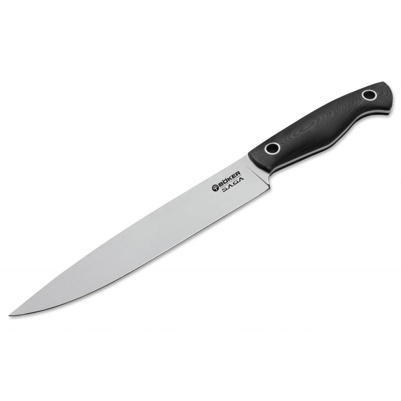 Our Boker Saga chef’s knife series – handcrafted by our manufactory in Solingen – raises the bar and brings the topic of “cutting in the kitchen” to a new level. Our decades of experience in the outdoor knife world coupled with the ingenuity and creativity of Danish knifemaker Jesper Voxnæs were incorporated into the concept and design of Saga in an effort to achieve a new level of performance in terms of ergonomics and cutting technology. The carefully orchestrated transfer of this joint know-how into the culinary field is proof that working with Boker Saga will be an entirely unique experience. The soft lines of the grips are made from indestructible black G10, which is equally impervious to temperature and moisture. The successful ergonomics already become apparent when the Boker Sage knife series is first handled: every curve, every bend in the line nestles itself into place on the hand, conveying absolute control and an exceptional cutting experience. The swallow-tail-shaped flare of the pommel on the larger models enhances grip security. Boker Saga owes its high strength to the full-tang design, which extends over the full length of the knife (in the same manner as on many hunting knives) from the blade tip to the pommel. The optimized cutting performance is not only guaranteed by the full flat grind of the blade with satin finish, but also by selecting 440C as the blade steel, which far surpasses the edge-holding and corrosion-resistance of conventional chef’s knife steels. A special note is achieved by the large hollow rivets, the unmistakable mark of Jesper Voxnæs.