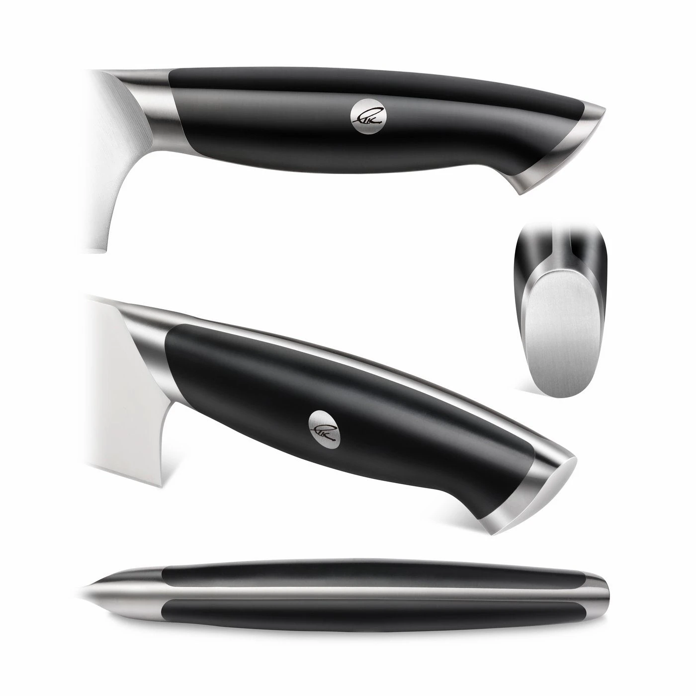 - Durable white polymer handles are contoured for a comfortable and ambidextrous grip. Polished bolster promotes a comfortable chef’s grip. Angled stainless-steel end cap adds beauty and balance.