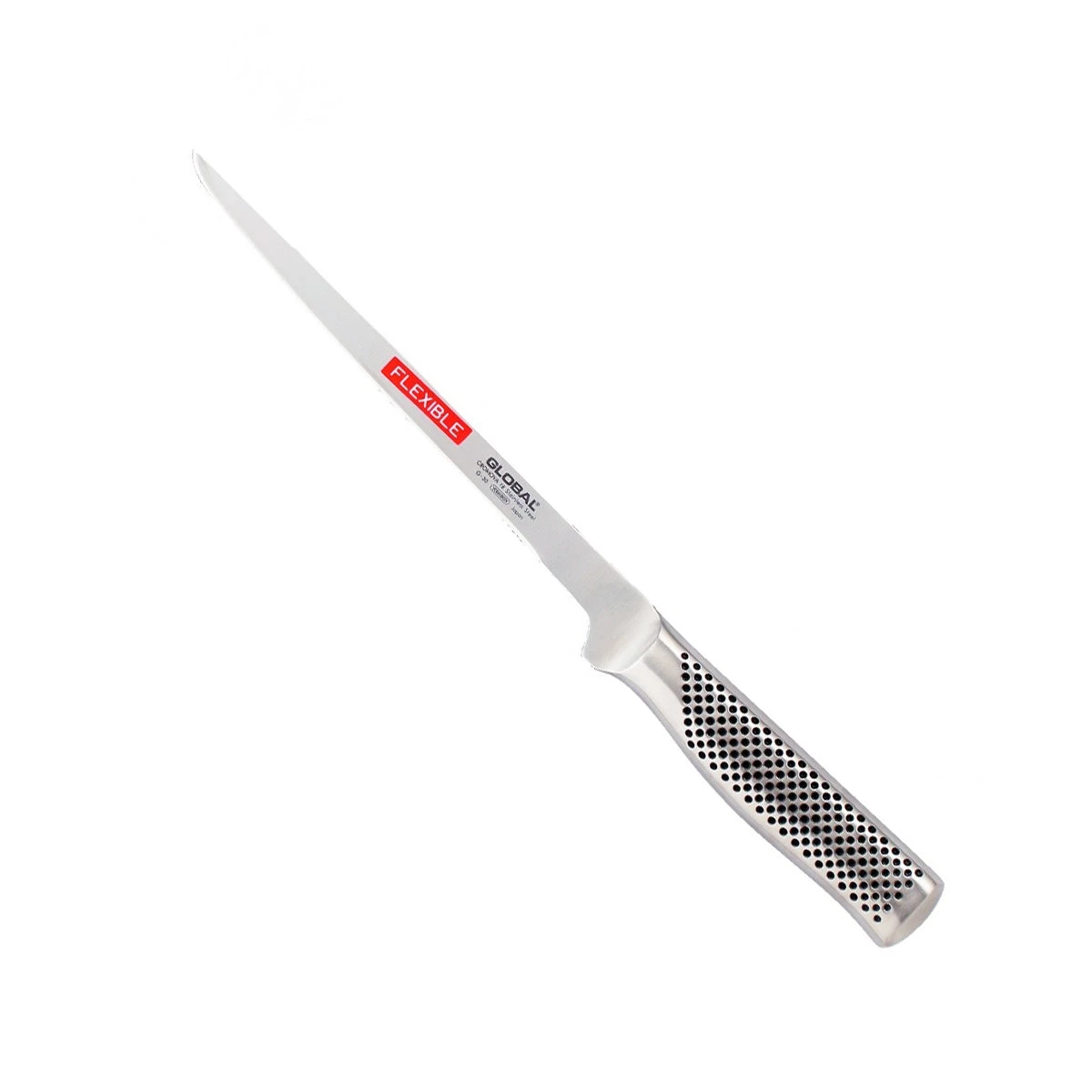 Global’s sleek, razor-sharp cutlery is an excellent choice for professional chefs and discerning home cooks alike. Designed in traditional Swedish filet style, this flexible knife bends softly and is perfect for cutting fish with precision. Double-beveled edge accommodates both right- and left-handed users. Lightweight design features perfect balance, helping reduce hand fatigue and providing you with greater control. Ergonomic, molded handle ensures comfortable slicing, and Global’s signature dimple pattern provides a stronger grip. Seamless construction from a single piece of high-tech CROMOVA stainless steel eliminates food and dirt traps. Hand wash. 8¼” blade. Limited lifetime warranty. Made in Japan. GLOBAL’S INNOVATIVE DESIGNGlobal’s award-winning knives are made to the exacting standards of professional Japanese chefs. To deliver perfect balance, Global manufactures hollow handles, then fills each one just enough to achieve the desired weight. – G-30 – 1 – B184-1