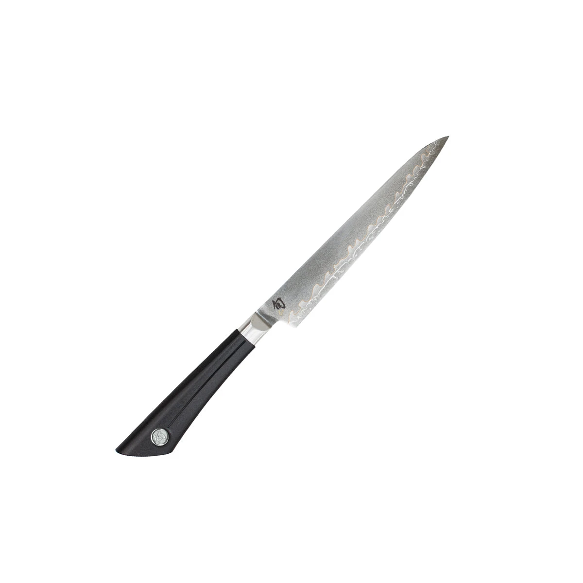 A utility knife is between a chef’s knife and a paring knife, but its blade is narrower and straighter. This makes it perfect for a multitude of small tasks where more precise cuts are needed, such as trimming broccoli, green beans, or other smaller vegetables. Some cooks like to use it in their hand, too—almost like a large paring knife. Others like its smaller size as an alternative to the chef’s knife. Utility knives are sometimes called sandwich knives because they work well on almost everything that goes into a sandwich—from thin-skinned vegetables such as tomatoes, to meats and cheeses. The Shun Sora Utility Knife is part of the exciting Shun Sora line that provides exceptional handcrafted Shun quality at an amazing price. Sora uses Shun’s proprietary Composite Blade technology to bring together a VG10 san mai cutting edge with a Japanese 420J stainless steel upper. This technology puts high-performance material exactly where it’s needed—on the edge. The two blade sections are laser cut, then fit together like pieces of a jigsaw puzzle. Braze welding permanently joins them. The attractive wavy pattern at the joint is based on traditional Japanese sword hamon lines. While Sora’s blade shapes and handle design are traditional Japanese, the textured PP/TPE polymer blend handle material provides a contemporary look, secure grip and balance, and is easy to maintain.