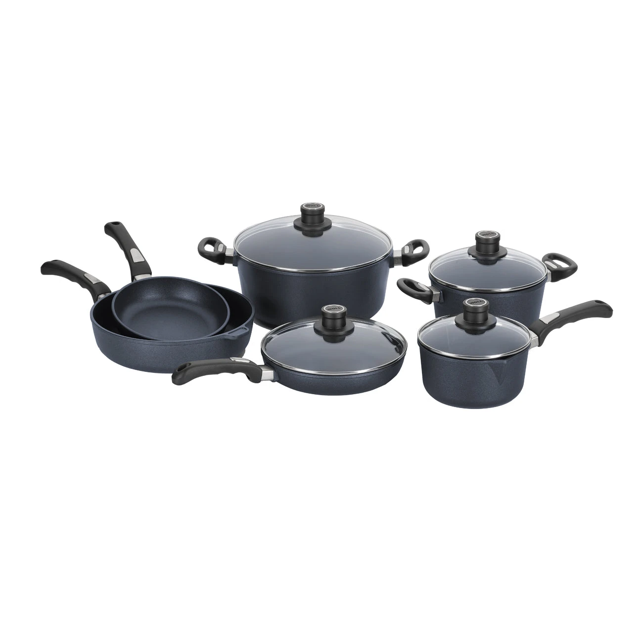 The superlative range: Diamond Plus pans, made of forge-cast aluminium, are given an ultra-hard coating impregnated with real diamond crystals. This makes it a pan with a particularly hard, scratch-proof surface, giving it a long service life and extraordinary non-stick properties. Whatever you are preparing – you can fry using almost no fat, as well as consuming very little energy thanks to the product’s excellent heat conduction properties. Fun and delicious taste are guaranteed. Diamond Plus is PFOA free, oven, dishwasher, and metal utensil safe. Made in Germany with a limited lifetime warranty. This Diamond Plus 10 pc Set is oven-proof (heat-resistant up to 480°F). Thermal bottom approximately .24″ thick. Forge-cast aluminium.